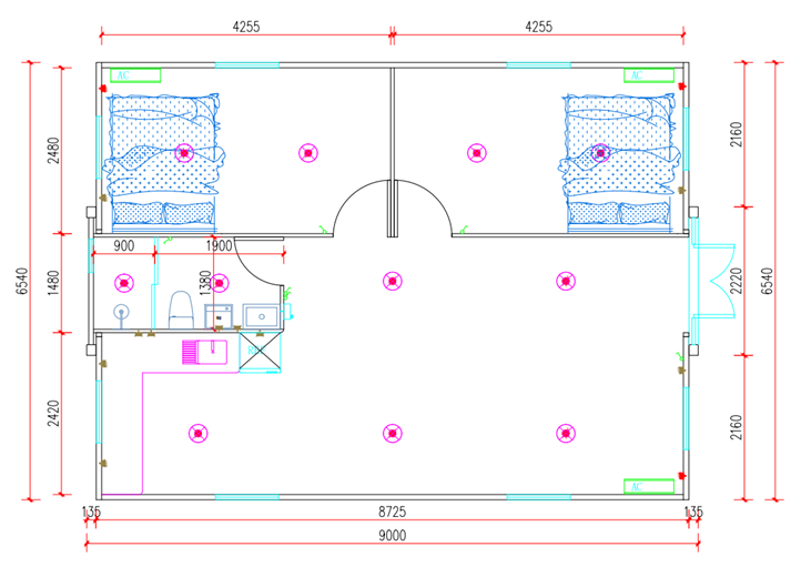 Dimensions extérieures de 9000 mm de longueur × 6540 mm de largeur × 2530 mm de hauteur, couvrant une superficie de 58,86 mètres carrés.